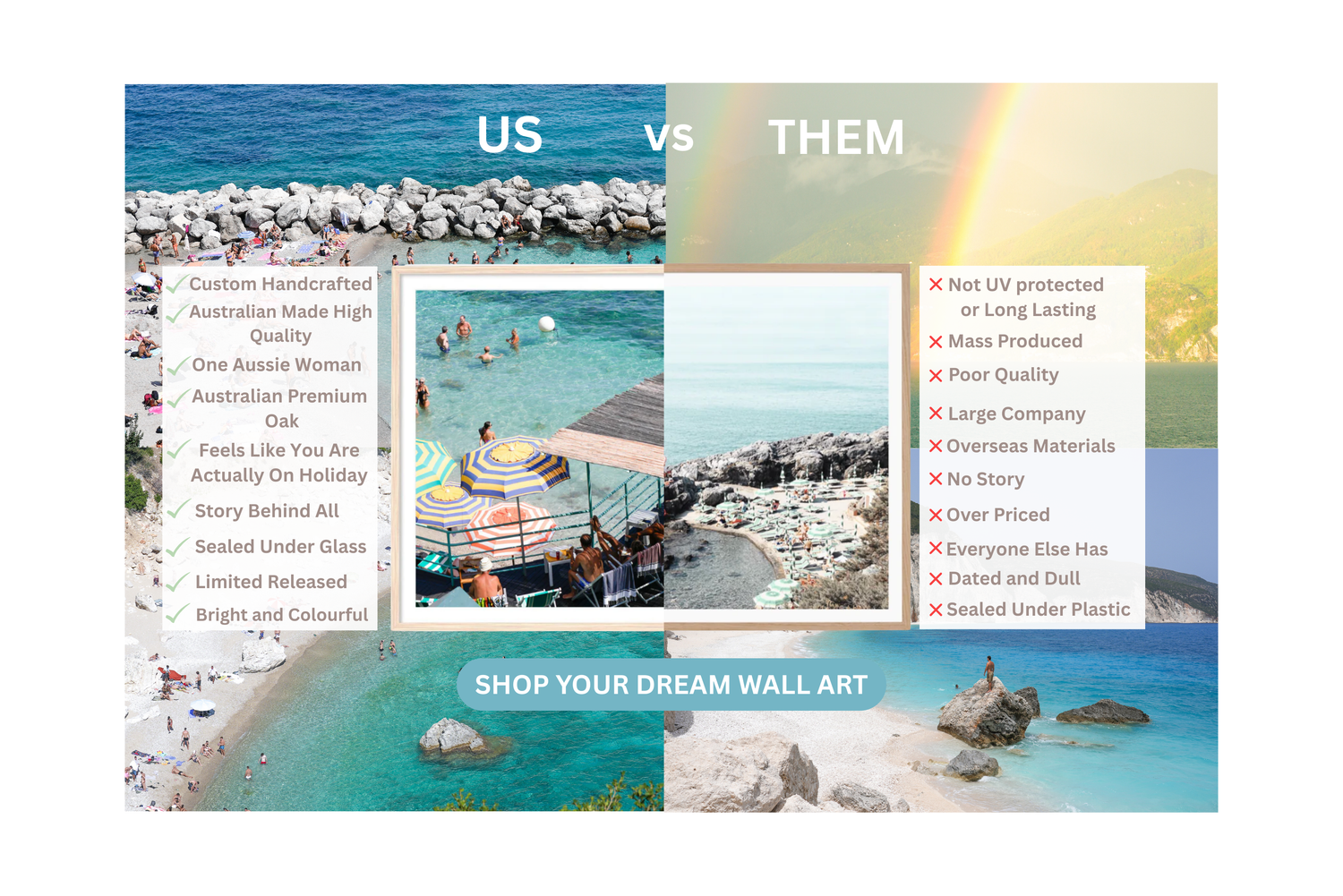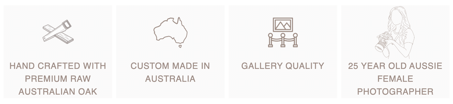 They are handcrafted in Victoria, Australia. Premium Print Framed behind either White or Aussie Raw Oak Premium Framed. Covered with Glass/Premium Acrylic with an acid-free backing board, ready to hang. Rigid String attached to back