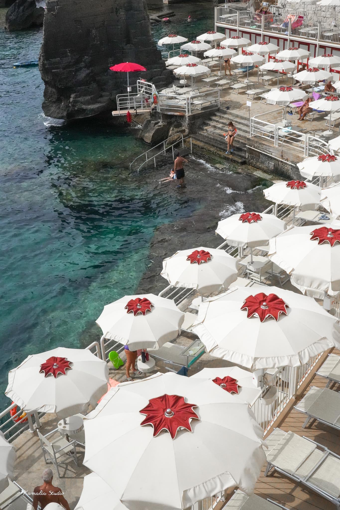 A shot of a Bagno Marino Archi beach club in Puglia, Italy is portrayed in this print.