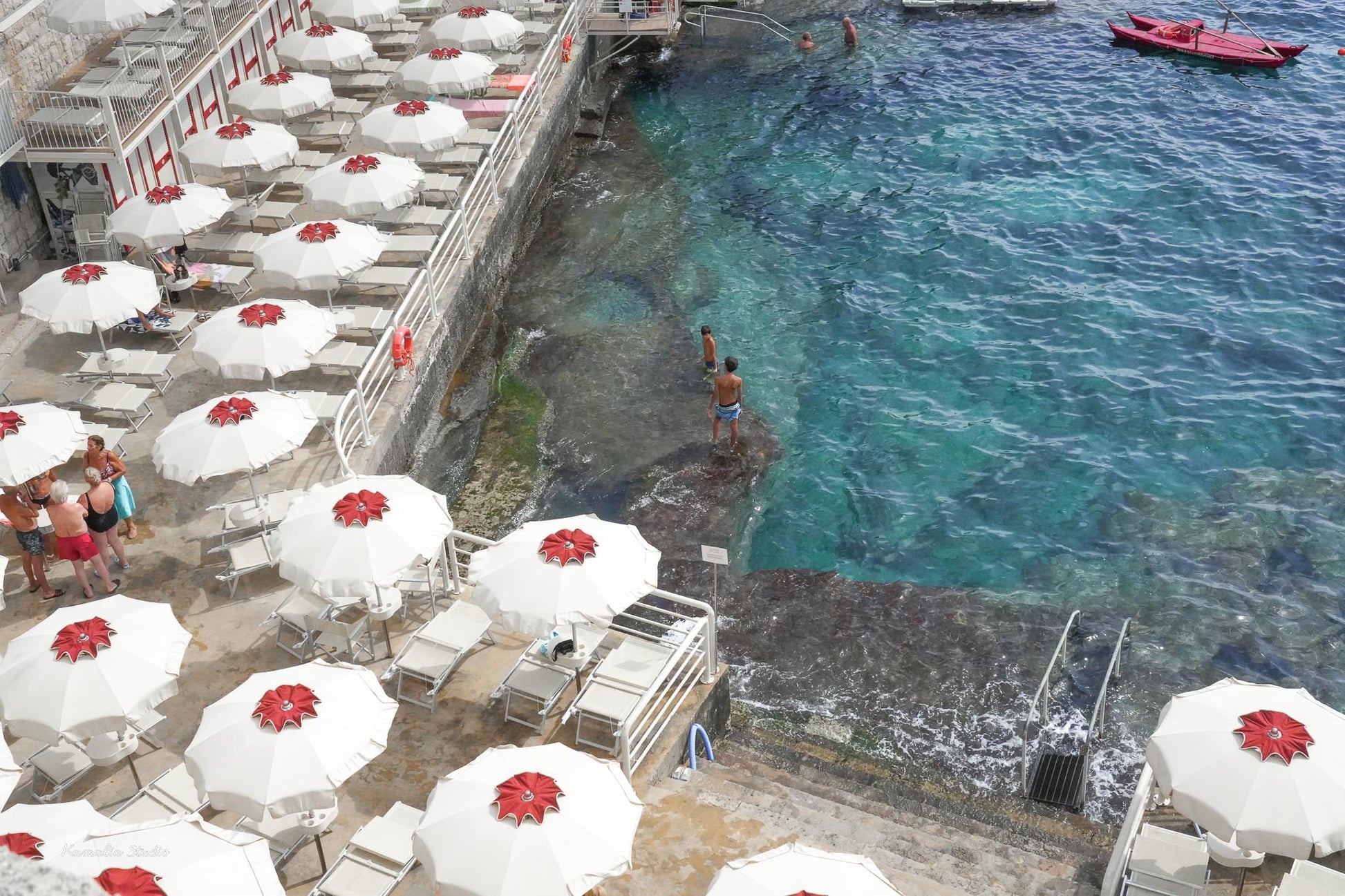 A shot of a Bagno Marino Archi beach club in Puglia, Italy is portrayed in this print.