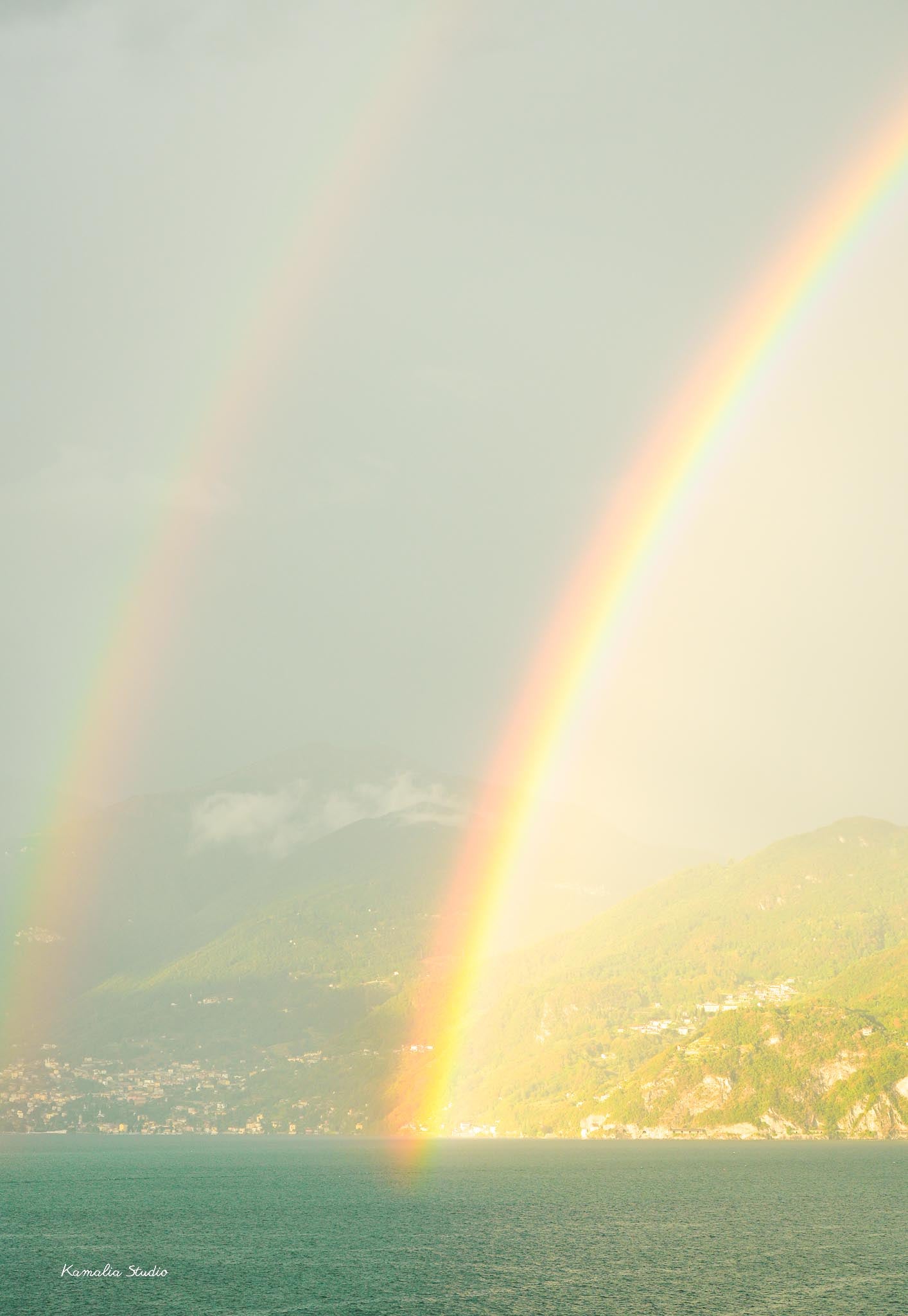 A shot of a double rainbow over the Lake of Lake Como is portrayed in this print.